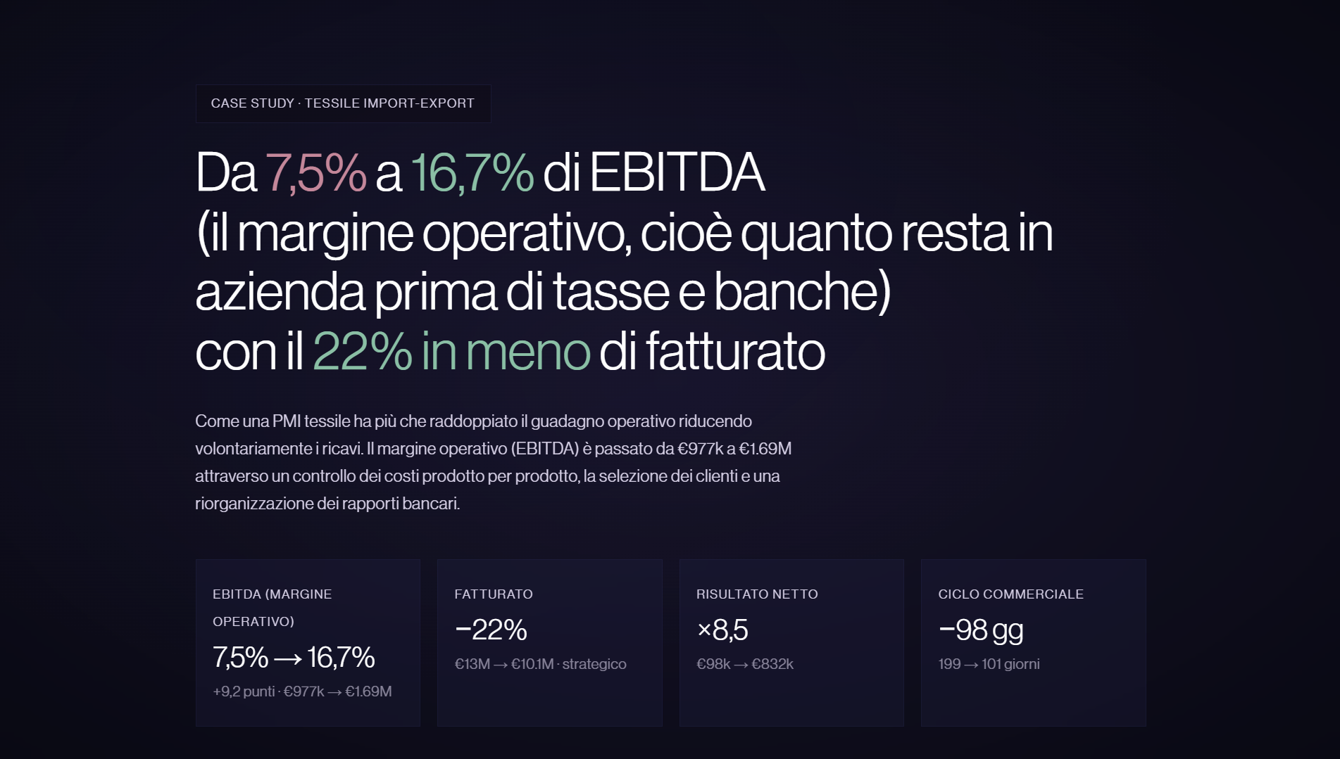 Una PMI tessile da €13 milioni di ricavi portava a casa €98.000 di utile netto. Lo 0,75%. L'azienda cresceva, il mercato rispondeva — eppure il margine restava schiacciato. €876k all'anno uscivano verso le banche. Il 22% dei clienti generava perdite. Nessuno sapeva quali prodotti facessero davvero guadagnare. Il problema non era il mercato. Era l'assenza dei numeri giusti per decidere.