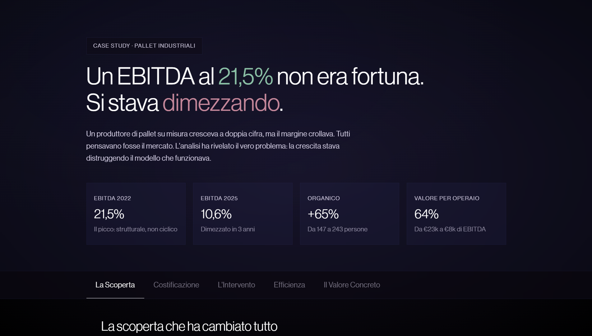 Un produttore di pallet su misura. EBITDA sceso dal 21,5% al 10,6% in tre anni. Il management dava la colpa al mercato. Noi abbiamo aperto i numeri — commessa per commessa. Quello che abbiamo trovato ha ribaltato tutto.