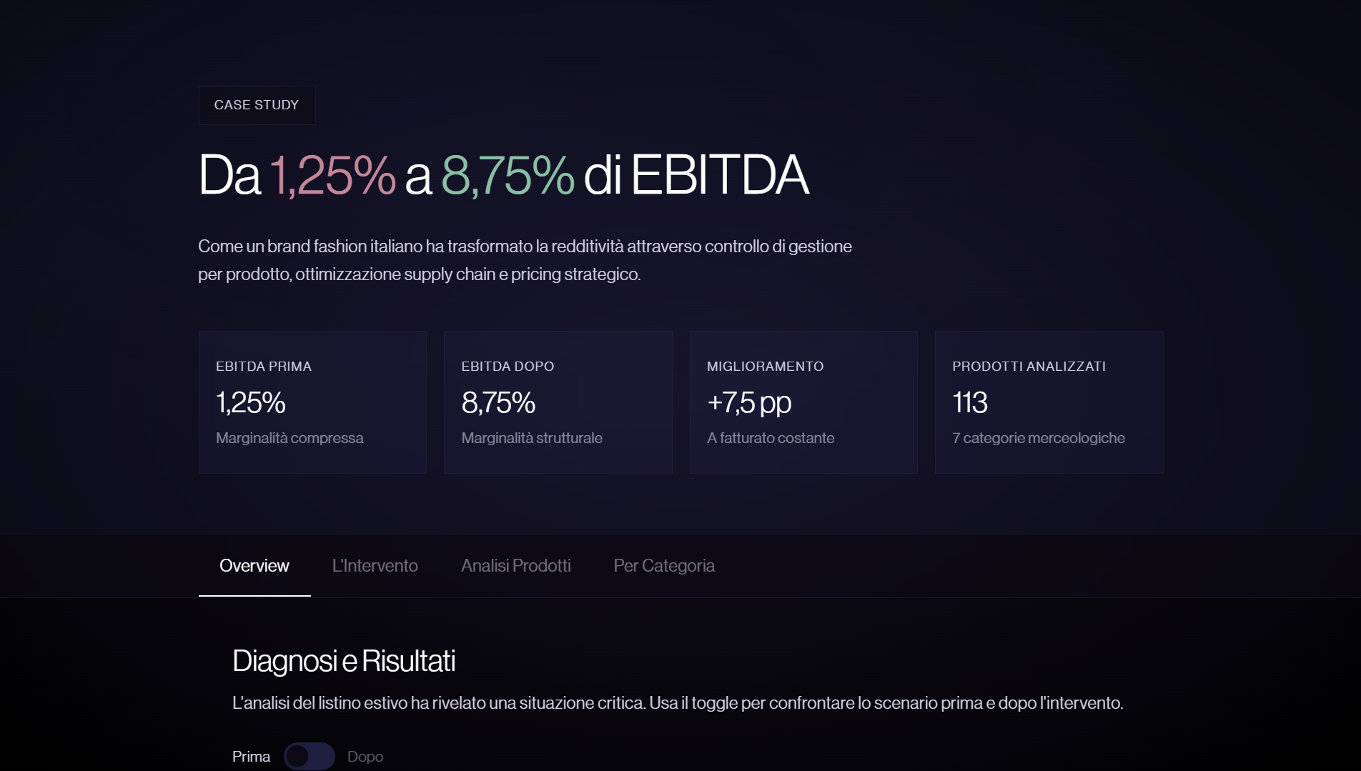 Un brand fashion italiano con 113 referenze nel listino estivo. Fatturato in crescita, team motivato, clienti soddisfatti. Eppure l'EBITDA era fermo all'1,25%. Il management dava la colpa al mercato. La verità era un'altra: nessuno aveva mai ricostruito il costo pieno di ogni singolo capo.