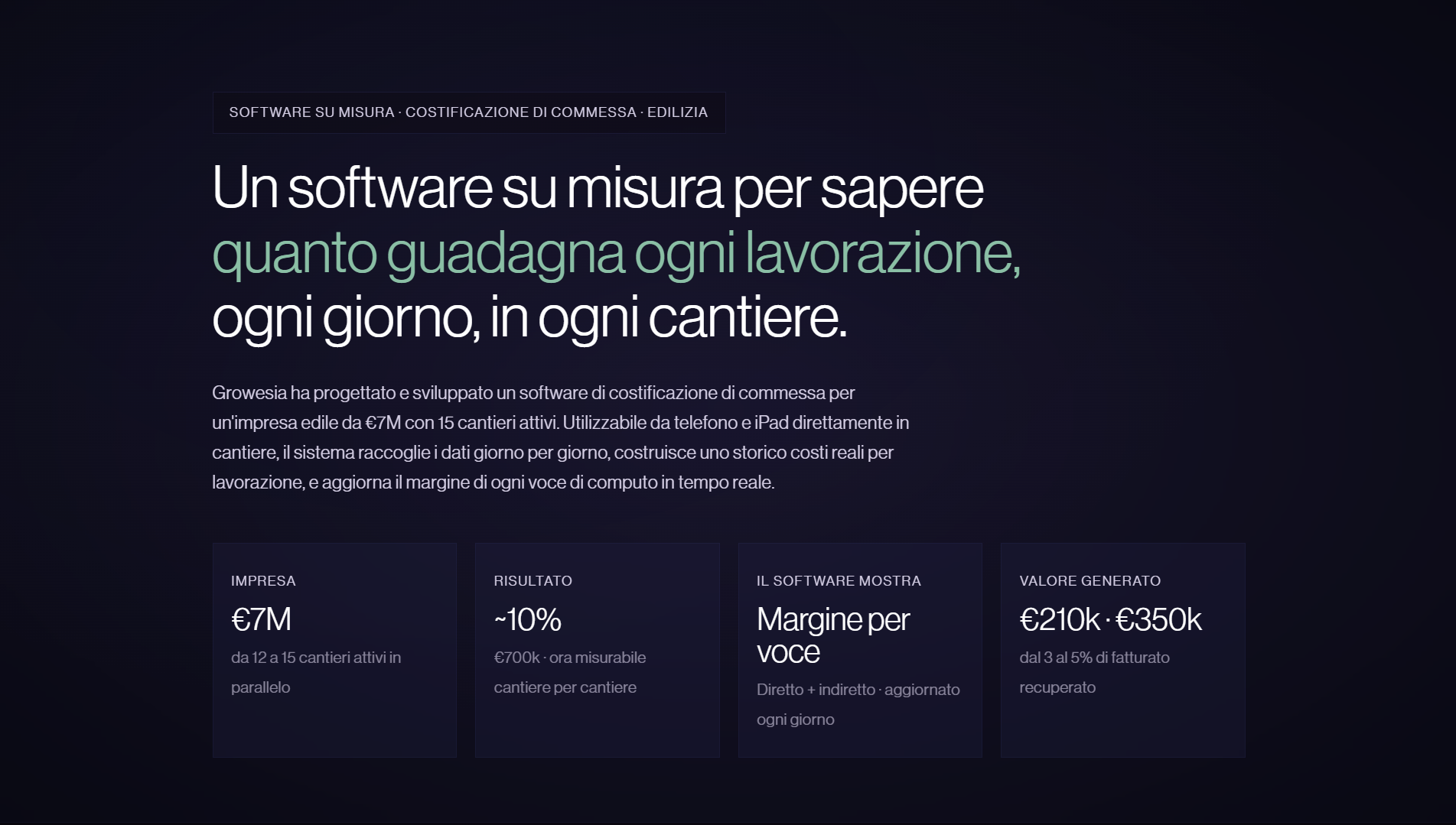 Un'impresa edile da €7M con 15 cantieri attivi non aveva visibilità sul margine delle singole lavorazioni. I costi venivano gestiti su Excel senza un metodo strutturato per commessa. Il margine di cantiere emergeva solo a fine anno, dal bilancio. Troppo tardi per intervenire.
